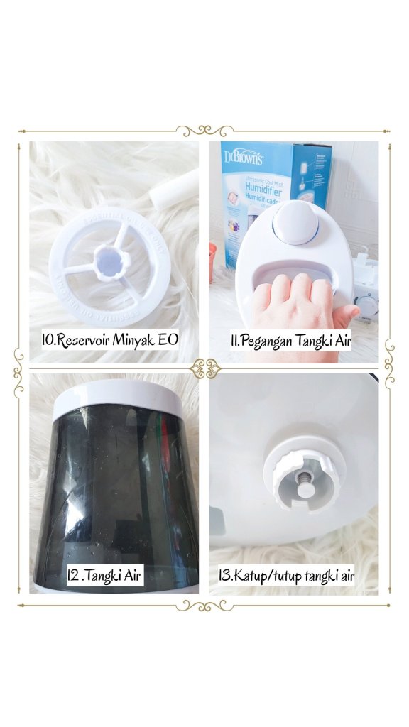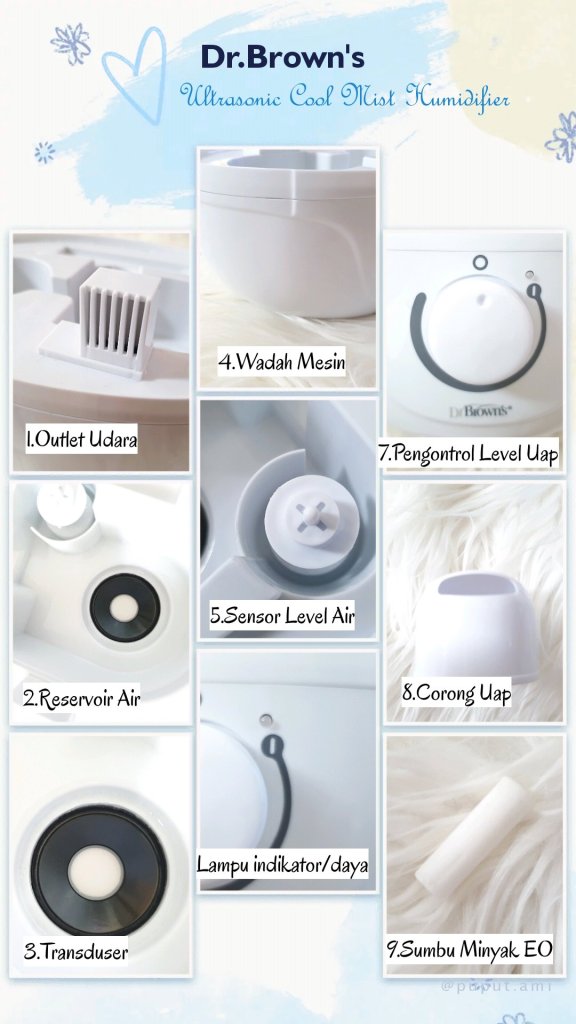 Sebelum aku bahas keunggulan lain Dr.Brown’s Ultrasonic Cool Mist Humidifier aku akan kasih tahu lebih dulu komponen Dr.Brown’s Ultrasonic Cool Mist Humidifier :